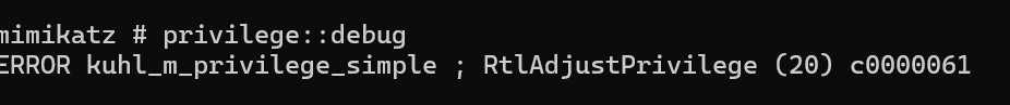 如果没有访问 lsass 进程的权限,那么这里的命令都会失败,就会出现如图的报错,这里是在 win11 下运行,可以发现哪怕有 debug也不行,就是访问不到 lsass 进程,除非使用 lsass 转储文件